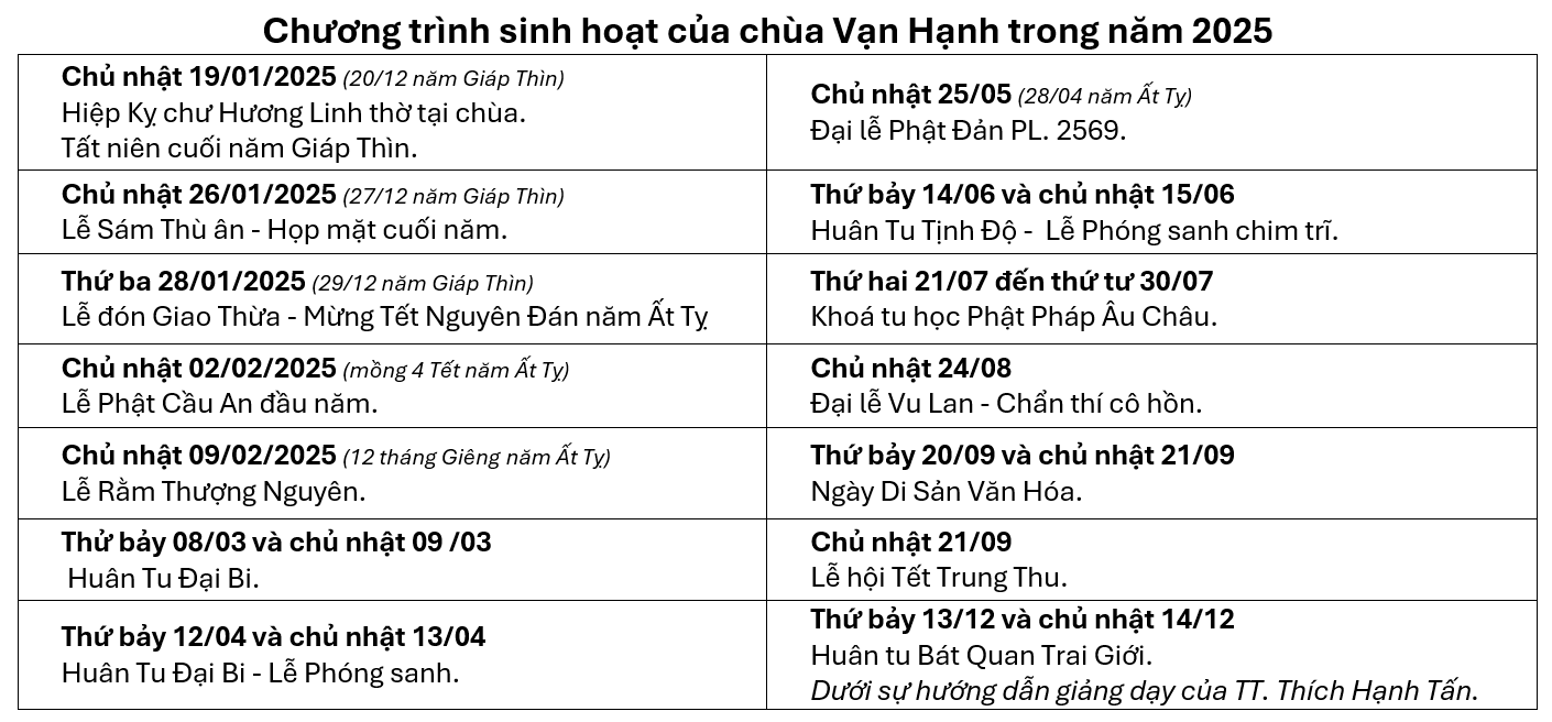 Chương trình sinh hoạt của chùa Vạn Hạnh trong năm 2025